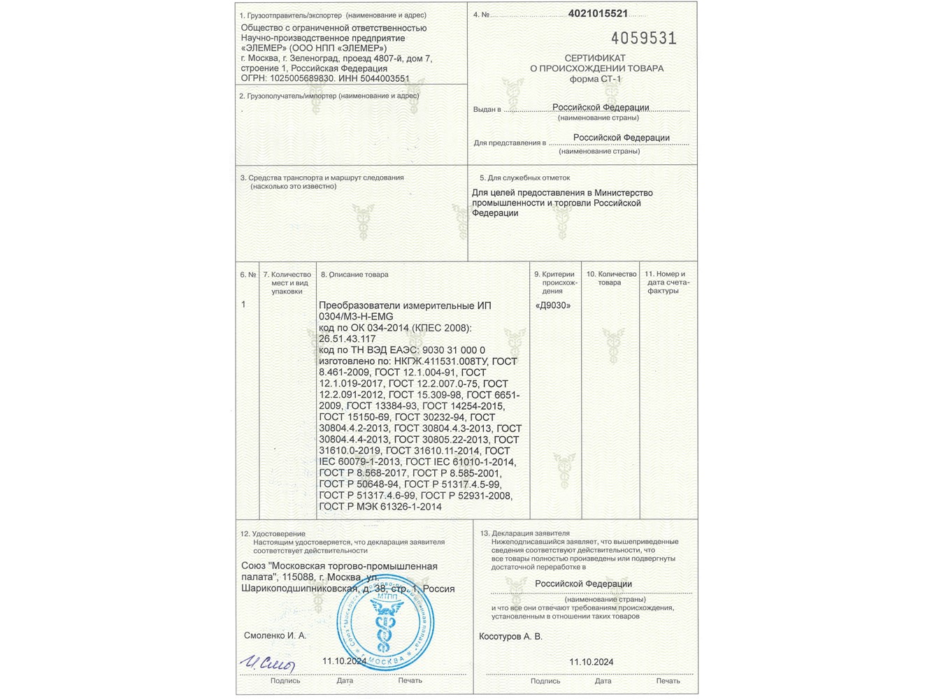 Наличие измерительных преобразователей в реестре подтверждается полученным Сертификатом о происхождении товара формы «СТ-1», который говорит о соответствии современным требованиям предприятий к поставляемой продукции и закрепляет ООО НПП «ЭЛЕМЕР» как отечественного разработчика и производителя современных средств измерений для нужд предприятий России и Содружества Независимых Государств.