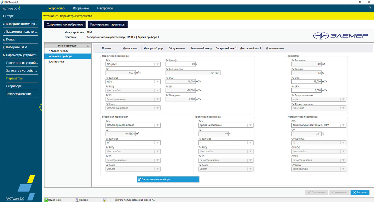 DTM-драйвер предоставляет программному обеспечению по стандарту FDT подробную информацию о текущем состоянии устройства, включая диагностические сообщения, коды ошибок и предупреждения. Это делает приборы ЭЛЕМЕР-РЭМ-2 более гибкими в составе распределенных систем управления. Работа DTM драйвера для ЭЛЕМЕР-РЭМ-2 успешно протестирована в программной среде PACTware.